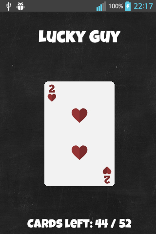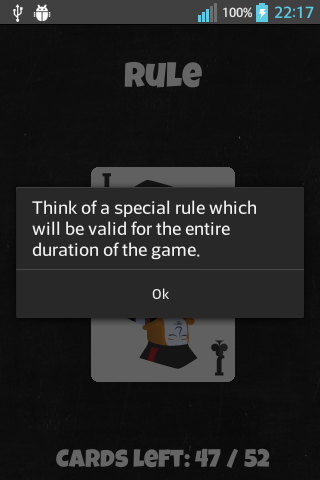 The game is played in accordance with the clockwise direction. A person starting the game draws a card. Each card corresponds to another special rule to which you have to adapt. After completing the task the next player starts. The game continues until all the cards are off the table, or all players lose a challenge with an alcoholic opponent.