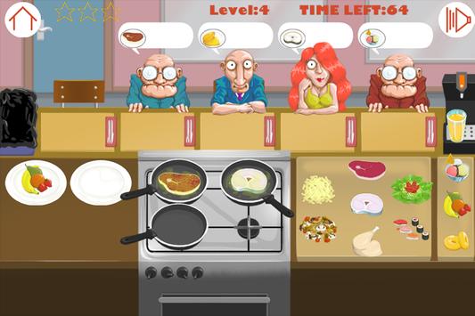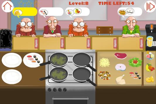 Finally a cooking game and one restaurant, completely free game which is not going to ask you to buy credits or nothing to advance the game. It is a blend of the best cooking games and restaurant in one, in which there are two modes to play, story mode where you have to go past the levels and endless mode where you have to go cooking and serving customers until you are completely eliminated. In Story mode when you go through the levels gaining cooking and serving star angers which can get better service in the kitchen and at the table can buy, new dishes, pans, cooking stoves for cooking more powerful faster a soda machine .......... How to Play: Customers entering the restaurant and you will order the food they want and you have to cook the careful it does not burn and the customer to leave and miss the game. You must serve food like chips, meat, sushi, vegetables, fish ....... Make this game your fun, remember you have to demonstrate your ability to cook and serve and so have the best restaurant in the world.
