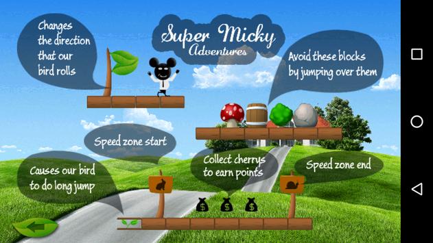 Super Micky Adventures is amazing adventure game, Super Micky have some problems and he need a lot of money to resolve it, your mission is to help Super Micky to collect the maximum of money.. Enjoy the game!
