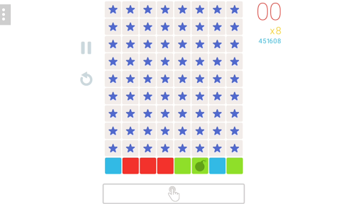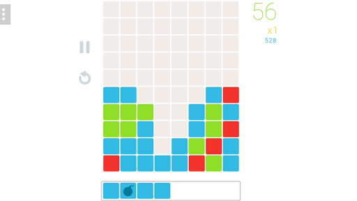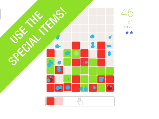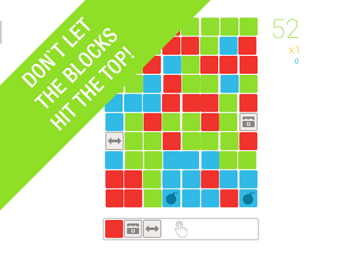 If you tap on the bottom bar where the blocks are created you can immediately send the whole row of blocks onto the playing field. This way you are able to create huge clusters of blocks and remove them all at once. Depending on how many blocks you destroy you will be given Power-Ups which are placed on the playing field automatically. These can destroy a complete line of blocks, a big cluster or several lines crosswise.