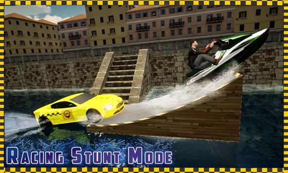 Drive the vehicle in city traffic to the destination to pick the passenger then drive the amphibious car to restaurant, hotels and residential areas for dropping the passengers. Push the pedal for high speed boost to ride taxi in rush. Water taxi car floating sim contains stunt mode as well in which yellow cab rider needs to jump over ramps, pass through hurdles and dodge heavy traffic of ferry, power boat and ship. These crazy stunt levels will be the test of impossible and deadly driver who like to drift and nitro boost the water surfer car for high speed.