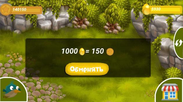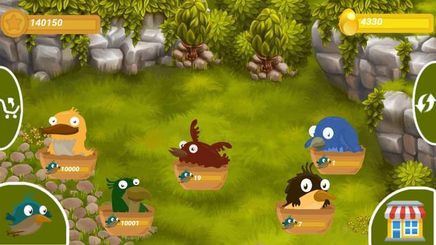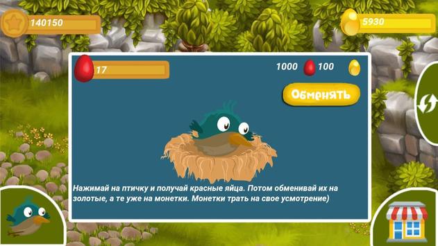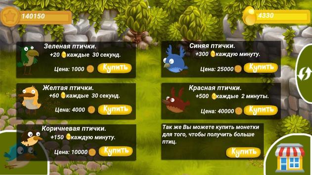 Денежные птички, которые будут приносить Вам яйца за определенный промежуток времени. Вам необходимо следить за тем, сколько яиц несет каждая птица и собирать их. После того, когда вы накопите определенное количество яиц, Вы можете обменять их на монетки и приобретать еще больше птичек, которые будут приносить Вам больше дохода каждые "2" минуты.