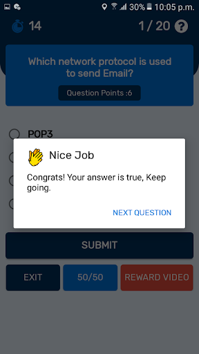 8- You can use rewarded video to remove 2 false answers, In this case the points will not be reduced.