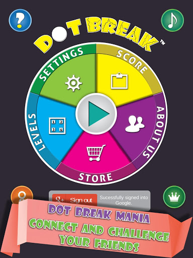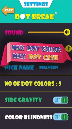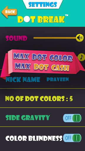 ✓In settings you can give Nickname,You can adjust Volume of Sounds and Music,you can set number of dot colours ( it will work only for Free Play ) ,you can switch on and off color blindness and Side gravity mode