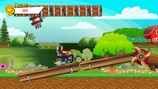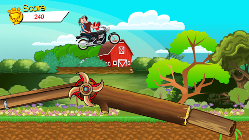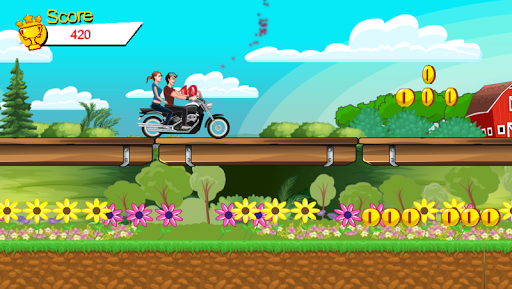 Compete with spectacular fast motorcycle.Climb the hills with your super bike. Fly the girl you love after you. Jump over the obstacles. No one can stop you. Go through all the obstacles and bring the girl to the safe zone.