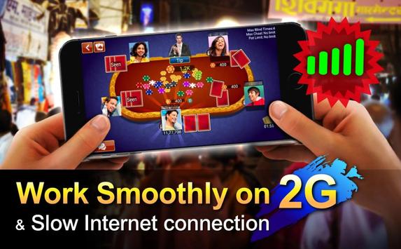 The game is played with a 52-card deck. The cards rank in the usual order from Ace (highest) to 2 (lowest). The usual actions like Blind, Chaal, Show are included.