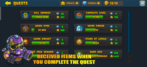 Don't forget to receive rewards as stars and gems after completing quests in the Quest section