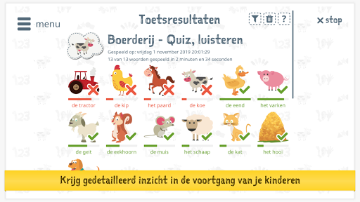 Liverge dan membaca keterampilan anak diukur oleh aplikasi, dan untuk orang tua dan pengawas di Zivic Halus melalui aplikasi. Hasilnya dapat disaring berdasarkan tema dan keterampilan.