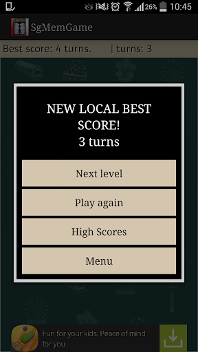 Sharpen and enhance your visual memory with this simple but enjoyable game. The game starts with image cards face down, and you flip over two cards at a time, trying to match the images on the two cards. Once you have successfully found all the matches at that level, you move on to the next level. This app contains multiple levels, plus casual and speed modes, for many hours of fun for everybody.