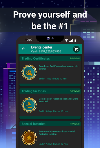 Earn huge rewards from periodic events by tearing up the competition: you will be able to compete in factory and index trading, market shares and much more.