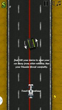 This Racing Car come with Facebook Friends option, the game allow you record "Your Top Score" in the Leader-board, the game is easiest to play just tilt your device to steer your car away from other vehicles. Use your Thunder Boost carefully. The Thunder Boost help you to speed up your car to across the others in the racing.