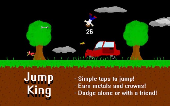 Test your luck and skill by dodgin arrows, birds, and fast cars! Gain metals and crowns. Try to get the gold metal! Play along with a friend to see who is the true Jump King! Tap anywhere during play to make your character jump.