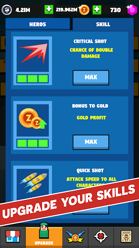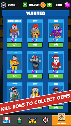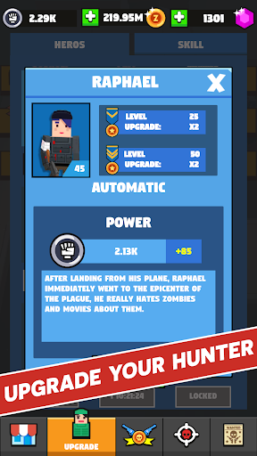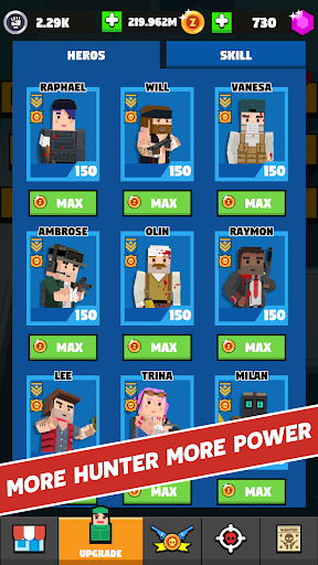 ● Seven brave surviving zombie hunters. Each has a 4 unique weapons;