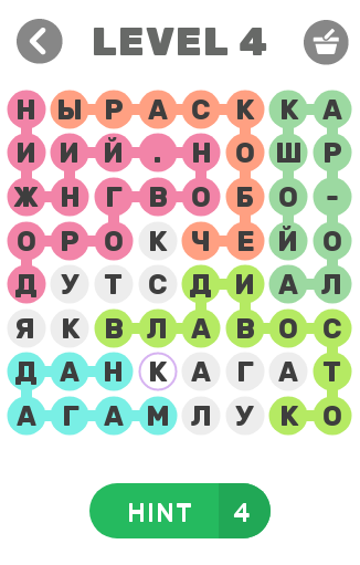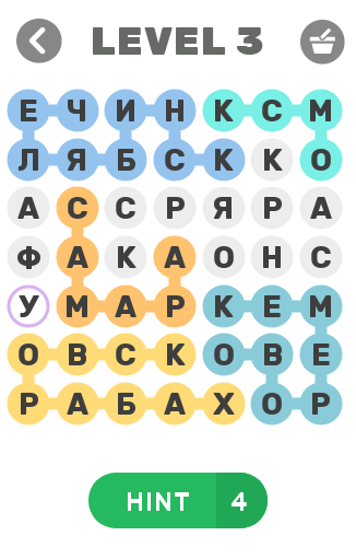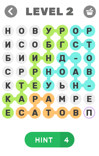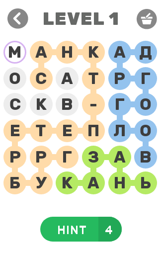 On each level, you will get a board with a set of letters. Your task is to find there chains of letters that form names of cities or towns (see examples on the screenshots), and to drag your finger on the screen over the found chain from the beginning of the name to its end.