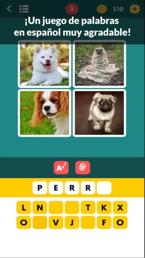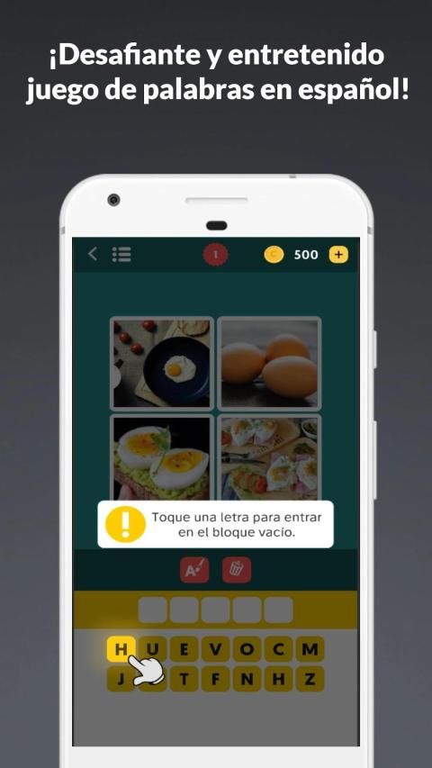 ¡Este es un juego de palabras en español muy entretenido y desafiante! El juego proporciona 4 fotos que describen 1 palabra. A veces es un juego de palabras en español muy difícil y luego puedes pedir una pista para identificar la palabra correcta. El juego de palabras en español proporciona imágenes de alta calidad ya que algunas de las palabras son muy difíciles de identificar. Si estás buscando un juego de palabras en español divertido e inteligente, entonces disfrutarás de este juego de palabras gratis.