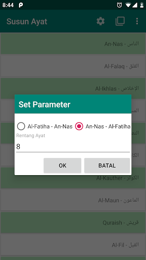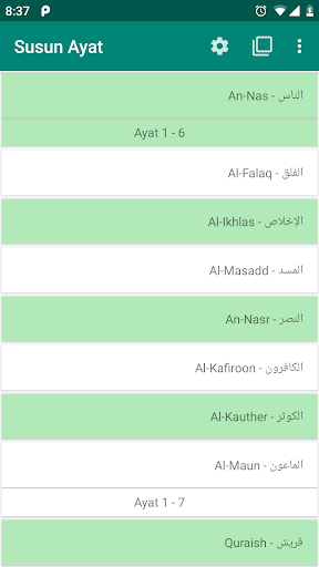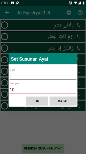 Pada game Susun Ayat ini pengguna bisa memilih surat dan jumlah ayat yang ingin disusun. Ayat akan ditampilkan dalam urutan yang acak dan pengguna harus menyusunnya sesuai dengan urutannya.