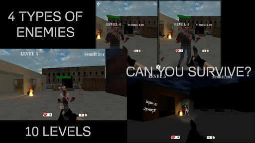 You can find 4 types of zombies and 10 intensive levels where you can test not only your agility but also your accuracy. Each type of zombie has different attributes and response differently to shooting. Stronger zombies will need more headshot to be killed where easier will by kill with just one headshot.