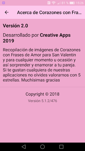 P.D: Dedicamos esta aplicación del Dia de la Amistad y del Amor a todas las parejas enamoradas así como a todos las personas que cultivan la amistad y el amor el 14 de Febrero y todos los días del año. Disfruta de nuestros Corazones con Frases de Amor.