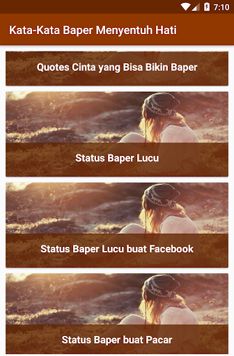 Aplikasi Kata-Kata Baper Menyentuh Hati ini adalah aplikasi yang berisi kumpulan kata-kata baper yang dapat mengungkapkan perasaan kamu ketika sedang baper. Ada ribuan kata-kata yang bisa bikin kamu baper dalam aplikasi ata-Kata Baper Menyentuh Hati ini, antara lain :