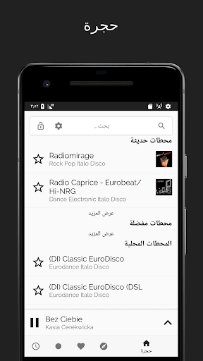 يمكنك وقف و استئناف البث بالراديو الخاص بك. إذا أرسلت المحطة معلومات حول الأغاني المشغلة، فكل الأغاني التي يتم الاستماع إليها تعرض و يمكن حفظها بنقرة واحدة.