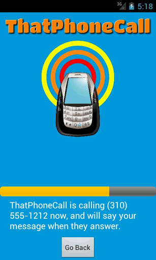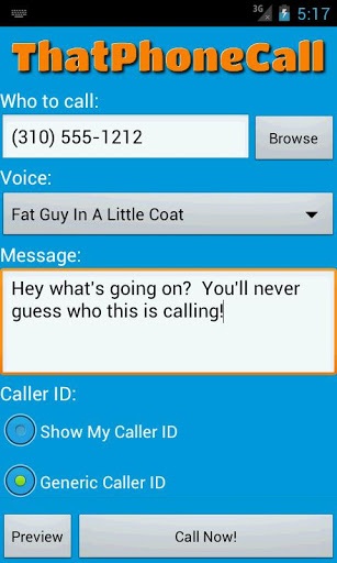 ThatPhoneCall The Best prank call EverHave fun pranking your friends .. Type in a message and choose who gets it.ThatPhoneCall will call them up and read your message with a real sounding voice.Your friends will never figure out quot;WHAT WAS THAT PHONE CALL??quot;Choose from the voices Fat guy in a little coat Roboman Helen Keller Starship Computer Supermodel Astrophysicist Prince Charles Brittish Pancho Villa Espaol