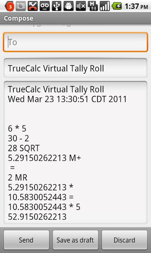 A calculator that looks and works like a calculatorIf you were disappointed with the calculator which came with your android phone, this is the app for you.A calculator which acts like a calculator.4function, plus memory square root and percent keys.Works on all phones with Android 2.2 or above.It has 15digit precision and uses scientific notation for output when necessary.A bonus feature is the ability to record all your working on a log, like an oldfashioned tally roll, which can be emailed to your computer and then printed as desired.