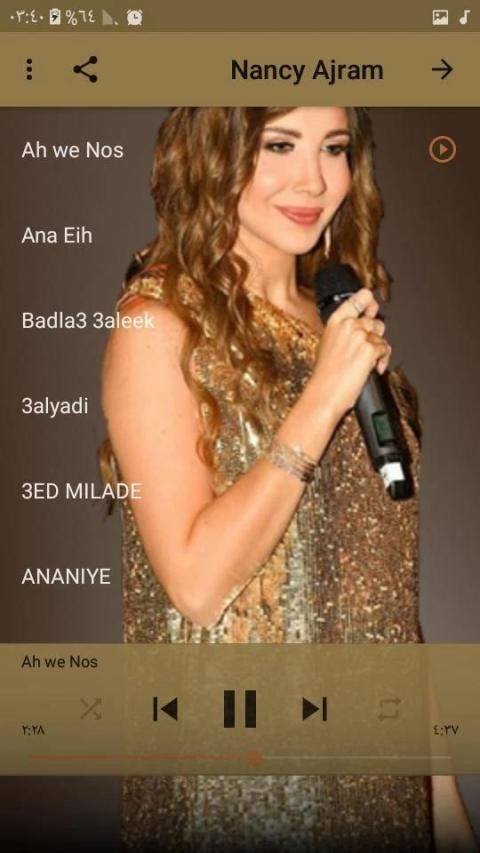 In this application you will find the new album Lyrics and updates from Nancy Ajram, download the free app and enjoy the songs from Nancy Ajram's playlist with a high quality voice and no internet music.