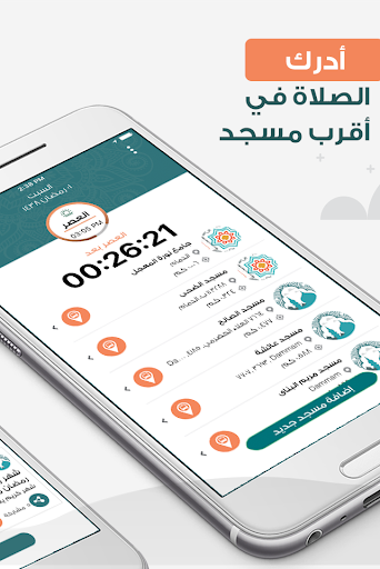 ويحتوي التطبيق على شاشة رئيسة تعرض أوقات الصلوات ، وكذلك الوقت المقدر بين الأذان والإقامة، وقائمة بأقرب المساجد إليك جغرافيًا والطريق إليها لتتمكن من إدراك الصلاة في وقتها، ايضا يحتوى التطبيق على خطب الجمعة لتتمكن من التعليق عليها.