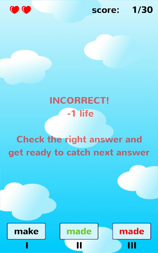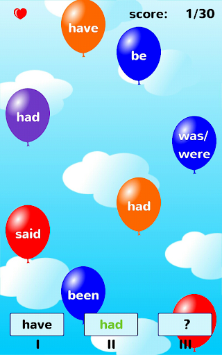 Rules are simple: just catch a balloon with the correct form of the shown irregular verb and get score points.