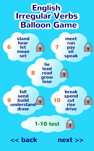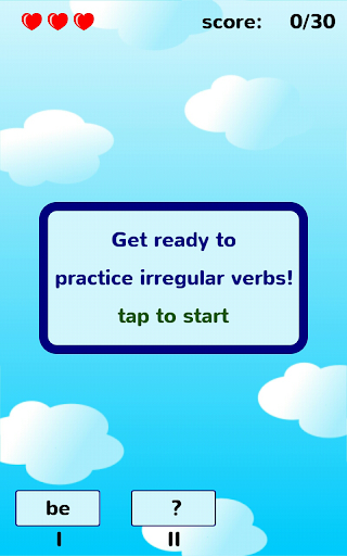 Each game level contains 5 irregular verbs to practice. After every 5 levels you will have to complete a test level with all previous learnt verbs.
