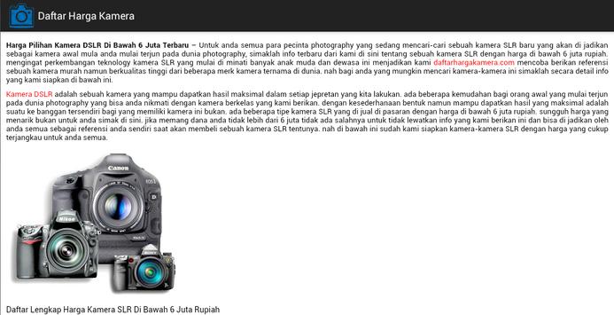Aplikasi Daftar Harga Kamera adalah sebuah informasi yang memudahkan kita untuk menemukan harga baru dan bekas berbagai merk dan brand kamera. Selain menjelaskan harga kita juga memberikan informasi atau review lengkap dari kamera ataupun Lensa kamera.