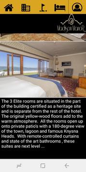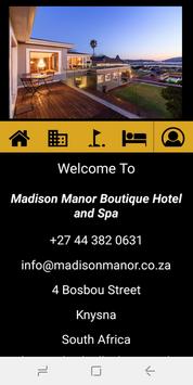 Madison Manor Boutique Hotel. With 17 uniquely decorated rooms, guests will be able to select the perfect suite for their needs. Swathed in history and splashed with flair and colour, each room has unique antique furniture depicting the Knysna - South African wood history. This app shows you all Hotel and local events and surrounding places