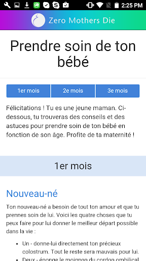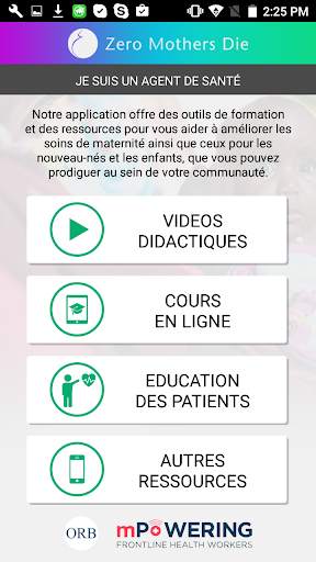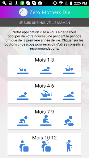 L’application Zero Mothers Die fournit des informations de base au sujet de la santé des mères, des nouveau-nés et des enfants. Elle donne des conseils pour assurer une grossesse saine et sur la manière de prendre soin des nouveau-nés, adaptés aux femmes enceintes, aux jeunes mères et à leur famille, ainsi qu’au personnel soignant de première ligne, afin d’aider à combler le manque de connaissances et de compétences en vue de réduire la mortalité maternelle et celle des nouveau-nés dans le monde.