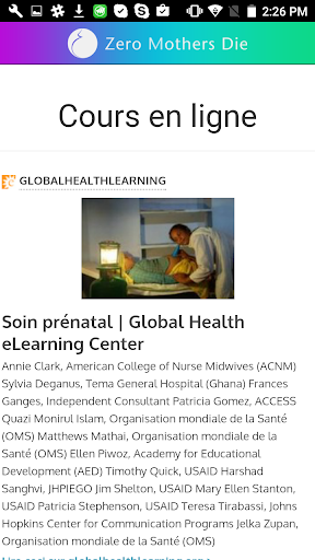 L’application Zero Mothers Die est adaptée particulièrement pour le contexte au Goma, RD Congo. L'application fournit des informations de base au sujet de la santé des mères, des nouveau-nés et des enfants de Goma au RD Congo, et des villages alentour, avec l'aide de nos partenaires locaux comme la Société Congolaise de la Pratique Sage-Femme, RD Congo, province du Nord Kivu (SCOSAF).