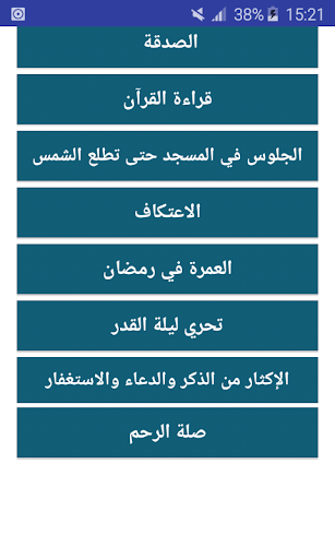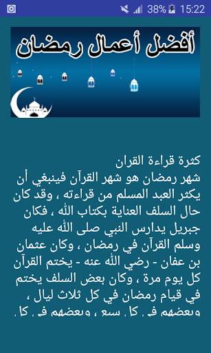 شهر رمضان هو شهر فضله الله على باقية الشهور و فيه يجتهد العبد في العمل من أجل التقرب إلى الله. فهو شهر الصيام و كذلك أعمال تقرب إلى الله. فبالإضافة إلى الصيام فهناك قراءة القرأن, و الصدقة, و الإعتكاف و صلة الرحم. و التطبيق يشتغل بدون نت.