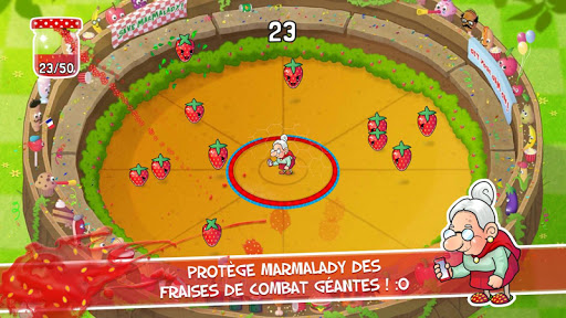 Kidnapée dans son jardin par les Fraises de combats en quête de vengance et jetée dans l'arène de combat - Marmalady a besoin de ton aide ! Réduis en purée les fraises avant qu'elles ne l'attrape ! Granny, juste avec son smartphone, peut envoyer par SMS des power-ups pour t'aider ! C'est parti pour une aventure fructueuse en action et en clics !