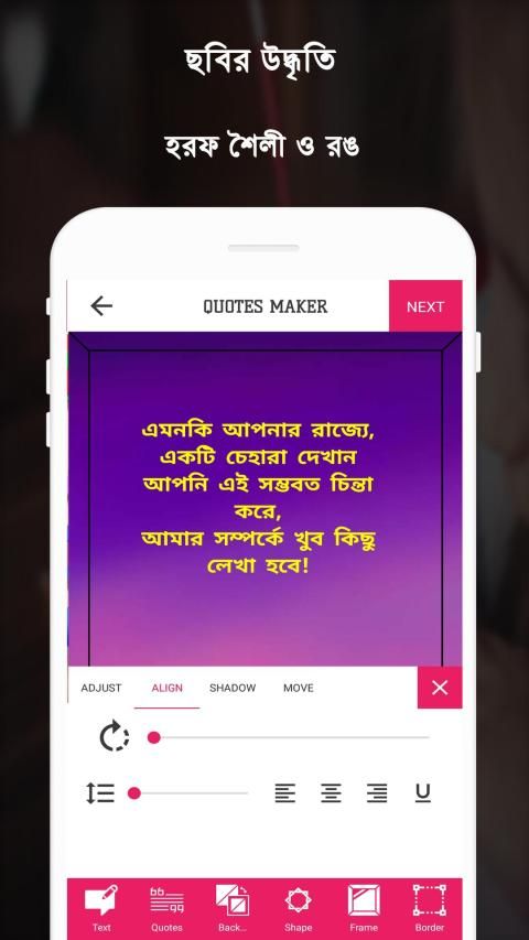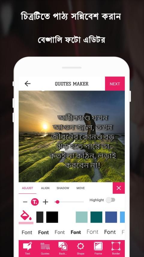 Write Bengali/Bangla Text on Photo is one of best app for to write quote, specially for Bengali/Bangla people to Write Bangla on Photo so download it today and start creating beautiful photos in Bengali writing and share your photos on social networking apps.