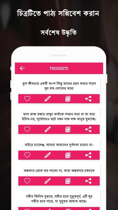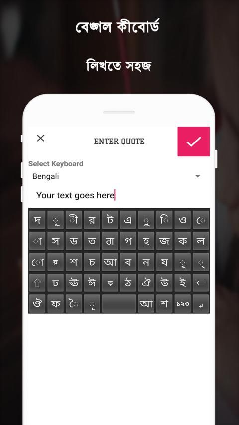 अपनी तस्वीरों या पृष्ठभूमि पर अपनी पसंदीदा बांग्ला भाषा में अपनी भावनाओं को लिखें और अपनी तस्वीर को सोशल मीडिया के माध्यम से अपने दोस्तों और परिवार के साथ बांग्ला पाठ के साथ साझा करें।