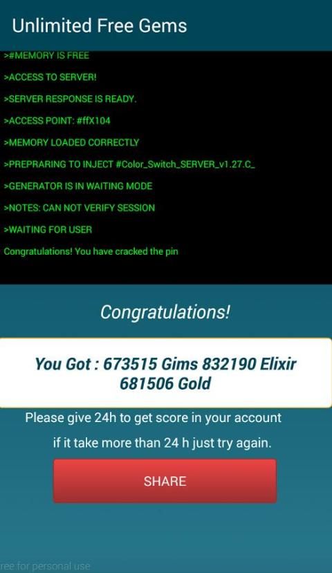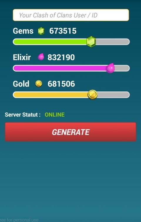इस एप्लिकेशन को एक वास्तविक उपकरण नहीं है और वास्तव में किसी भी रत्न, सोना, अमृत या डार्क अमृत उत्पन्न नहीं करता है। यह सिर्फ एक yourfriends साथ और कुलों खिलाड़ियों के संघर्ष के साथ मस्ती करने के लिए शरारत है।