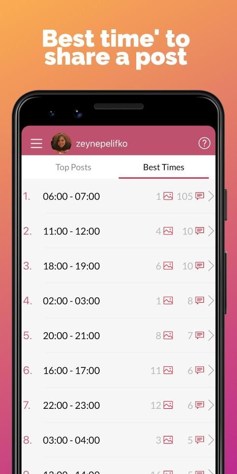 ऐप विश्लेषण करता है कि अधिक पसंद करने के लिए पोस्ट साझा करने के लिए सबसे अधिक इंटरैक्शन प्राप्त करने के लिए सबसे अच्छा समय अंतराल रिपोर्ट करता है।