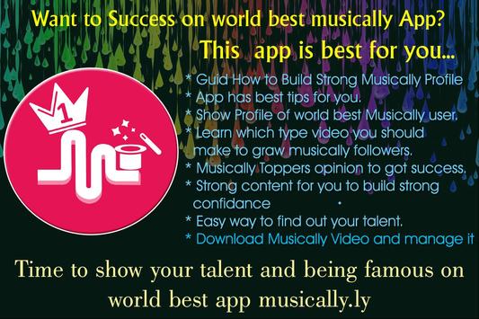 With the help of this Musically Tips and toppers app You know and learn how to be famous on Musical.ly app,How to express your creativity and rack up the likes in musical.ly, Also which types video need to make to grow fast, who are the musically toppers and why they are famous etc...