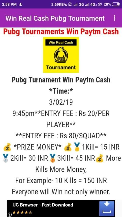 Have you ever read one of those reviews about a app? 30,000+ users downloaded Win Real Cash Pubg Tournament latest version on 9Apps for free every week! Players who wants to play both because this app is good and because the app are response quickly at any time. This hot app was released on 2019-02-13. Why not download and have a try?