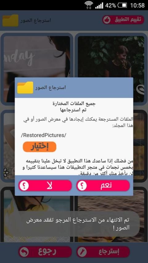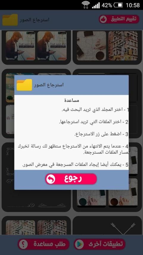 برنامج استرجاع الصور المحذوفة هو تطبيق لإستعادة الصور المحذوفه عن طريق الخطأ من الهاتف و من بطاقة الذاكرة.