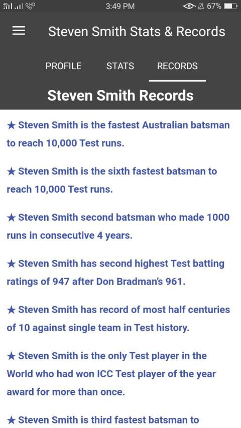 And whenever he will create new record in any Cricket format, we will update that record information in this app so you can always know Steven Smith new International Cricket records in Test, ODI and T20.