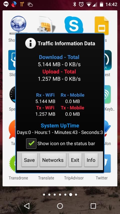 TrafficMon (Traffic Monitoring Data) is a small app that allows you to constantly monitor all traffic data on your Smartphone / Tablet. Monitors the traffic data updating in real-time an indicator in the status bar.