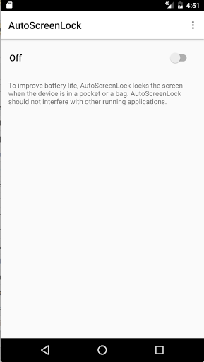 Usage: Set the switch to "on" if you want to start the service and "off" if you want to stop it. Note that it will stay "on" until you switch to "off" because it is made to run even without the AutoScreenLock running in the background.