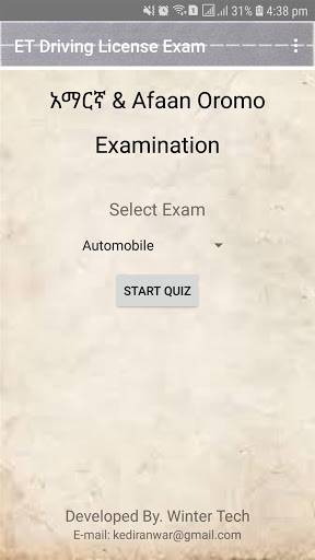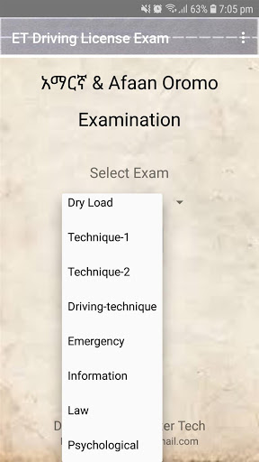 The first multi-option driver's license test application includes bilingual options in Amharic and Afan Oromo with more than 3,000 questions and answers in 10 different categories: Public-1, Public Transportation, Dry Load, Driving Technique, Information as well as Driving Law, Psychology and more Questions and answers carefully prepared for anyone looking for knowledge in this special field.
