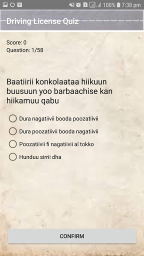 የመጀመሪያው ባለብዙ አማራጭ የመንጃ ፍቃድ ፈተና መለማመጃ መተግበሪያ በሁለት ቋንቋ አማራጮች እነሱም በአማርኛ እና በአፋን ኦሮሞ በ 10 የተለያዩ ምድቦች ከ 3 ሺህ በላይ ጥያቄዎች እስከ