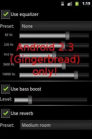 - का समर्थन करता है तुल्यकारक, बास को बढ़ावा देने, और Android 2.3 के साथ उपकरणों पर reverb