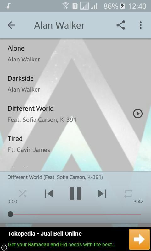 Aplikasi khusus lagu-lagu Alan Walker lengkap secara offline sehingga tidak perlu menggunakan kouta internet agar menghemat kouta internet anda